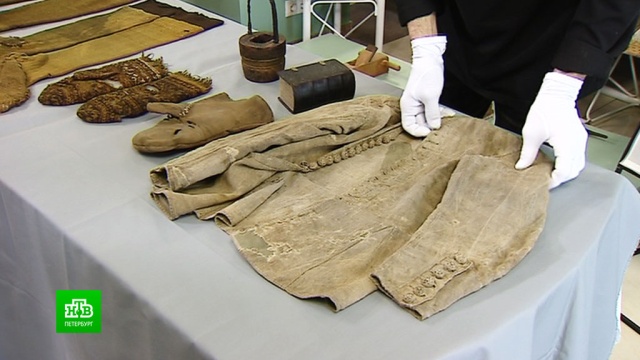 Это шерстяные чулки ручной вязки с элементами декора и многочисленными заплатами, шерстяные варежки со скандинавским орнаментом и морской льняной кафтан, скорее всего, принадлежавший одному из юнг.