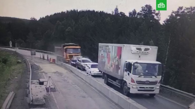 Авария произошла на ремонтируемом участке трассы, где на одной полосе скопились и встали несколько машин. На кадрах видно, как грузовик таранит сзади несколько стоящих на трассе легковушек. Водитель фуры сказал, что у его большегруза отказали тормоза.