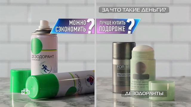 Твердый антиперспирант (то есть средство, не только борющееся с запахом, но и останавливающее выделение пота) от американского бренда обойдется в 2000 рублей. Реклама обещает максимальную защиту. Правда, не сказано надолго ли. Роликовый дезодорант стоит в 10 раз дешевле, но сухость гарантирует на двое суток. Еще в 5 раз ниже цена у простого дезодоранта из супермаркета, но и обещания здесь скромные — только борьба с запахом.