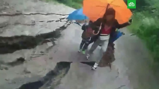 В городе Яремче Ивано-Франковской области из-за ливней обрушилась трасса. Женщина с детьми, которые шли по ней, едва не провалились под землю.