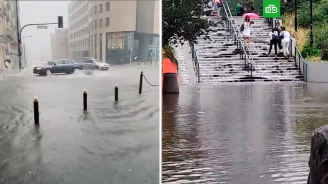 Сильный ливень, обрушившийся сегодня на столицу Польши, затопил улицы и вызвал транспортный коллапс.