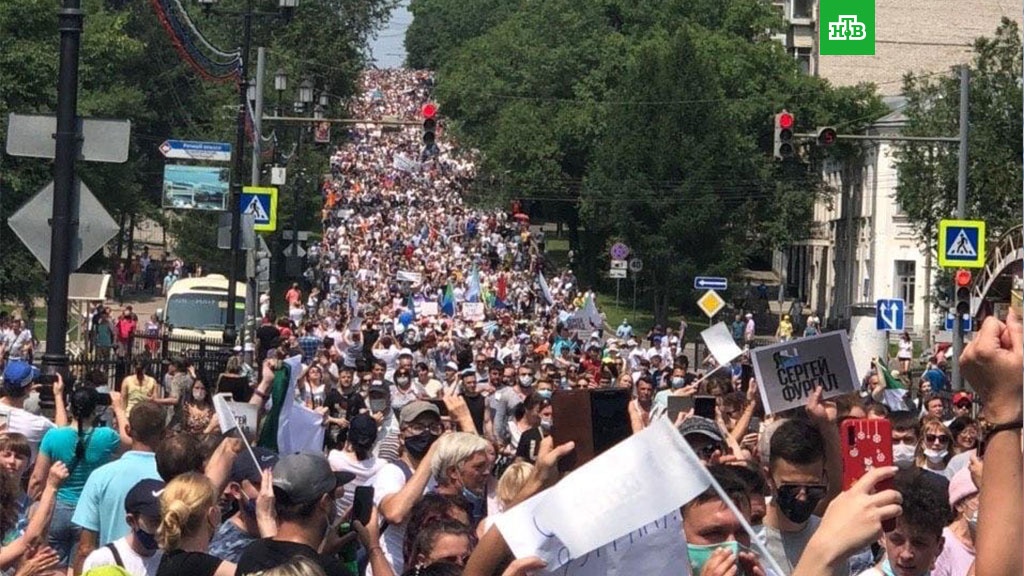 Седьмой стихийный митинг проходит в поддержку арестованного губернатора Хабаровского края Сергея Фургала в Хабаровске. В субботу в знак солидарности с хабаровчанами вышли на акцию и жители Приморского края.
