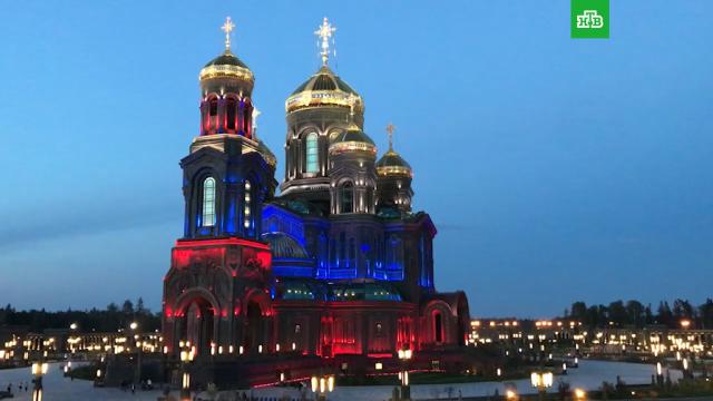 В Подмосковье стены главного храма Вооруженных сил РФ подсветили цветами российского флага.