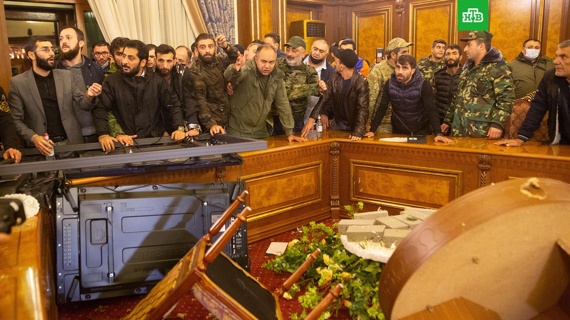 Акции протеста и беспорядки вспыхнули в Ереване после подписания соглашения о прекращении боевых действий в Нагорном Карабахе. Протестующие ворвались в здание правительства и парламент, разгромив мебель и технику, разбив двери и окна, в том числе в кабинете Пашиняна. Одновременно часть демонстрантов попыталась прорваться к правительственным дачам.