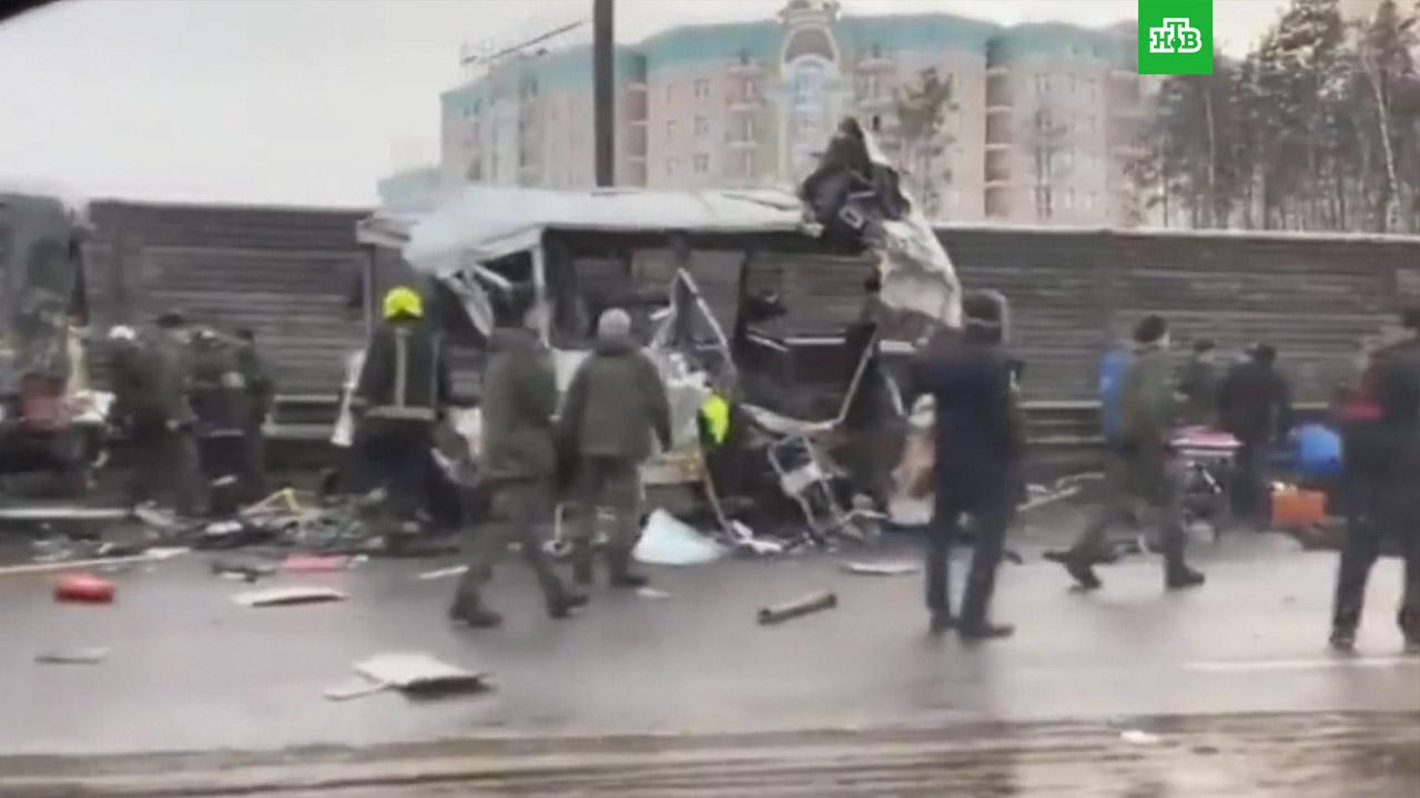ДТП произошло днем 11 января на Новорижском шоссе. Водитель самосвала протаранил стоящую на обочине колонну военных автобусов. В них находились