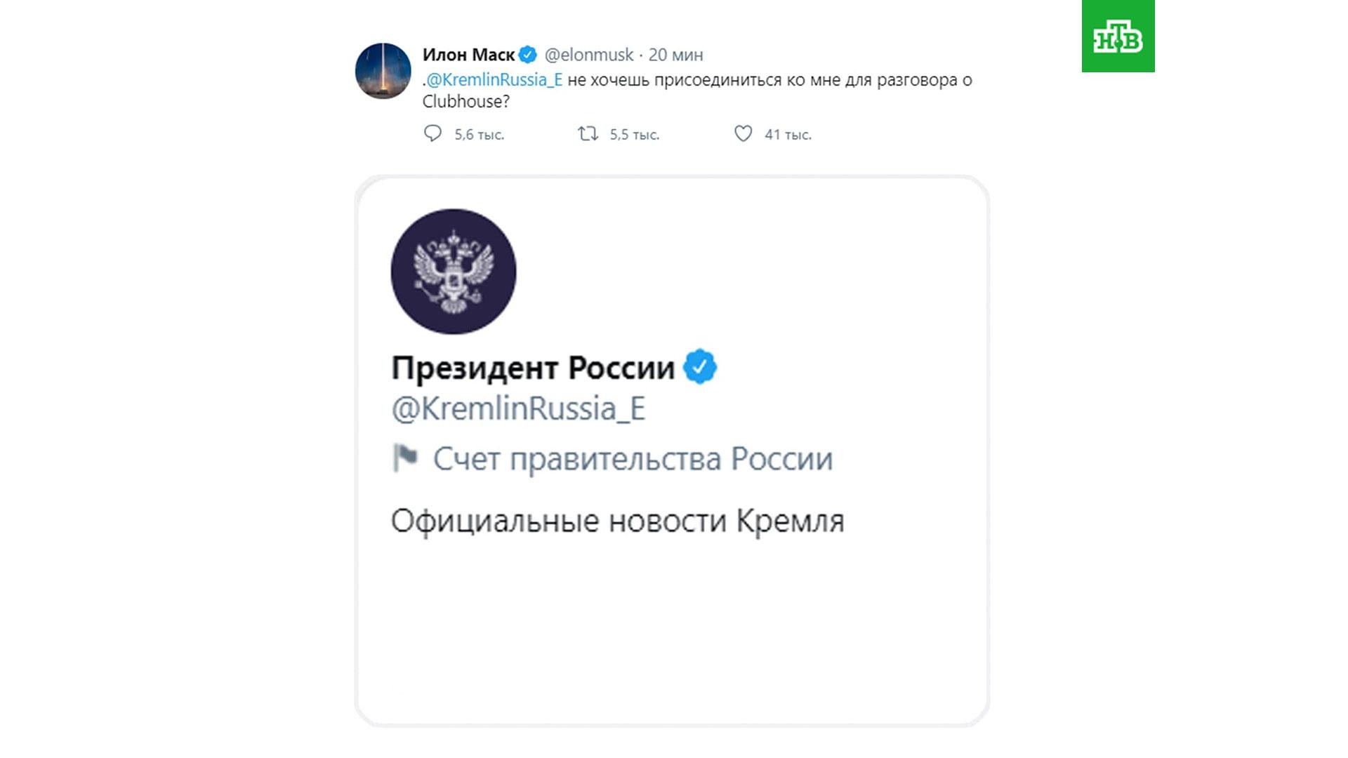 «Не хотели бы вы присоединиться ко мне для разговора в Clubhouse?» — написал Илон Маск, отметив в сообщении официальный англоязычный аккаунт президента РФ.