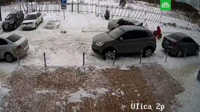 На размещенных в Сети кадрах видно, как из подъезда жилого дома выходит женщина с коляской, в которой сидит ребенок. Она подходит к водителю автомобиля, который стоит на проезжей части, и о