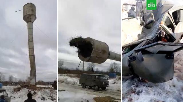 Не слишком удачно закончились работы по ремонту водонапорной башни в Тверской области. Микроавтобус коммунальщиков эти ремонтные работы не пережил. Как, впрочем, и сама башня.