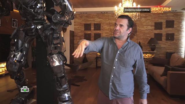 Актер Сергей Астахов превратил свою квартиру в арт-объект . В просторной гостиной стеллажи во всю стену для сувениров, камин с поленицей для уюта и как особое украшение пространства железный человек до потолка.