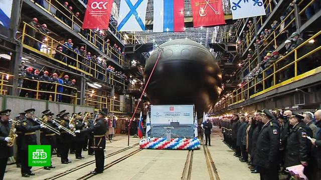 На «Адмиралтейских верфях» сегодня на воду спустили подводную лодку «Магадан». Это третья субмарина по счету в тихоокеанской серии.