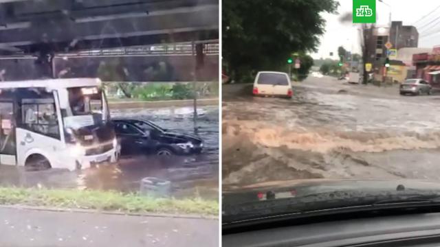 Ливень, обрушившийся на Ростов-на-Дону сегодня утром, затопил в городе улицы, а также железнодорожный вокзал. Видео и фото публикуют в соцсетях местных жители.