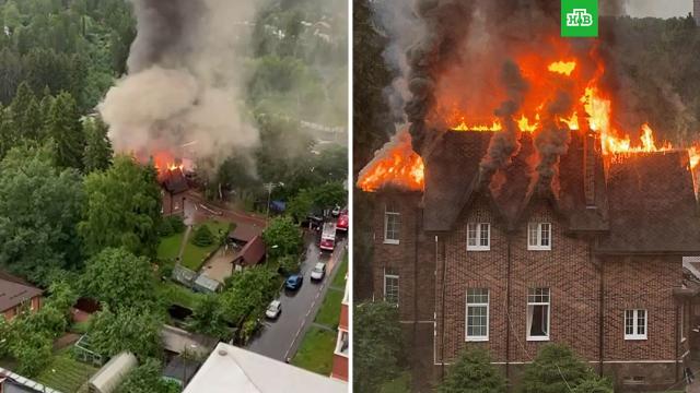 В подмосковных Химках коттедж загорелся после удара молнии. Происшествие сняли на видео очевидцы.