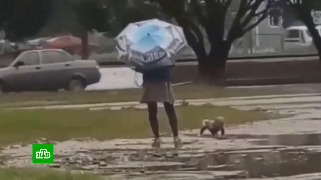 Инцидент произошел в одном из дворов Великого Новгорода. На кадрах, снятых очевидцами, видно: на малыше из одежды — лишь подгузник. Рядом с ним стоит женщина, возможно, мать. Она одета в куртку и держит над собой зонт.