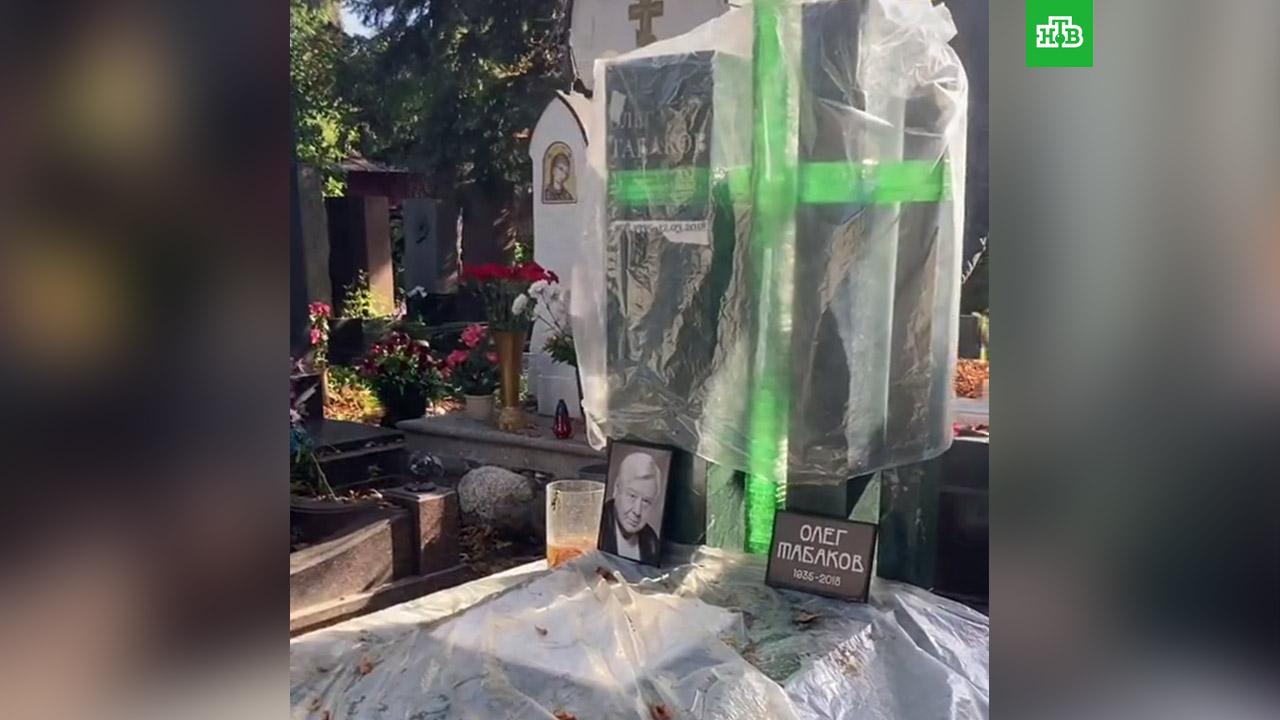 Через 3 года после смерти любимого миллионами режиссера и актера Олега Табакова на его могиле на Новодевичьем кладбище появился монумент. Под пленкой, которой накрыт памятник, угадывается крест из зеленого хрусталя и черно-зеленая могильная плита.