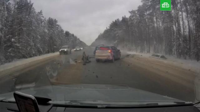 На кадрах видно, что иномарку заносит на дороге, она вылетает на встречную полосу, где врезается в другую машину. Протараненный автомобиль улетает в кювет. При столкновении двух легковушек задело еще одну машину.
