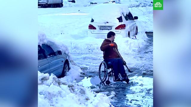 На кадрах видно, как инвалид, сидя в коляске, убирает снег с тротуара лопатой. «Маленький мой, уже целый час там возится. Юра, мне кажется плохая затея, там снега много!» — говорит женский голос за кадром.