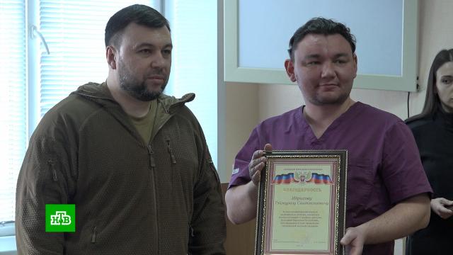 Сегодня в Донецке награждали российских врачей, которые приехали в Донбасс работать в больницах и госпиталях. Раненых много, квалифицированных медиков, которые могут не только делать перевязки, но и проводить операции, не хватает. Помощь россиян очень нужна. Все они волонтеры, трудятся бесплатно в свои отпуска.