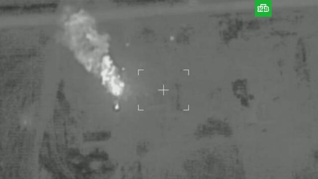 На кадрах видно, как несколько боеприпасов попадают в склады, после чего начинается пожар.