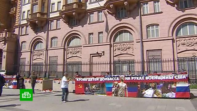 В День защиты детей активисты в Москве устроили памятную акцию. На здании американского посольства ночью появилось видео о погибших в Донбассе детях.