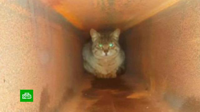 Накануне животное замуровали строители в стальной конструкции нового моста. Местные жители вытащить кота своими силами не смогли, поэтому позвали на помощь спасателей.