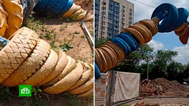 В Хорошёво-Мнёвниках рабочие демонтировали «Шинозавра» фигуру из старых автомобильных покрышек.
