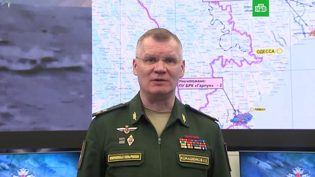 Высокоточным оружием морского базирования в районе населенного пункта Лиман Одесской области уничтожены две доставленные из Великобритании установки берегового ракетного комплекса Harpoon. Об этом сообщил на брифинге официальный представитель Минобороны РФ Игорь Конашенков.