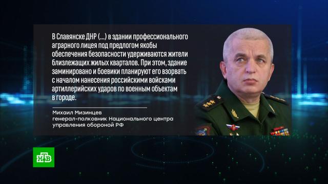Михаил Мизинцев, начальник Национального центра управления обороной РФ: «Достоверно установлено, что в Славянске Донецкой народной республики украинскими националистами готовится очередная циничная провокация с гибелью мирного населения для обвинения российских ВС в нанесении неизбирательных ударов по гражданским объектам. С этой целью в здании профессионального аграрного лицея на улице Науки под предлогом якобы обеспечения безопасности удерживаются жители близлежащих жилых кварталов. При этом здание заминировано, боевики планируют его взорвать с началом нанесения российскими войсками артиллерийских ударов по военным объектам в городе».