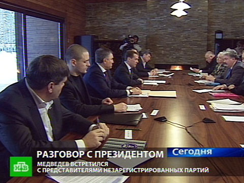 Несколько дней назад, здесь же в загородной резиденции, Дмитрий Медведев встречался с лидерами семи зарегистрированных партий, чтобы обсудить планы политической реформы. И, по словам президента, лидеры партий разделяют далеко не все предложенные изменения. В частности, сокращение минимального количества партийцев, необходимого для государственной регистрации партии.