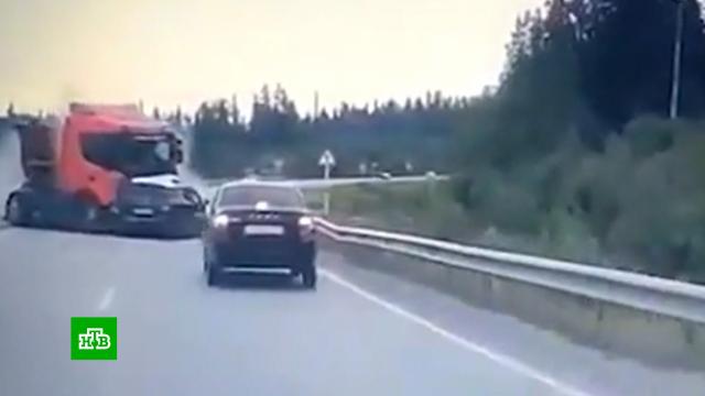 Водитель Skoda выехал на встречную полосу и врезался в грузовик, после чего большегруз занесло и он снес «Ладу». Удар был такой силы, что легковушка перелетела через ограждение и оказалась в кювете. Пострадала и машина, регистратор которой снял автокатастрофу.