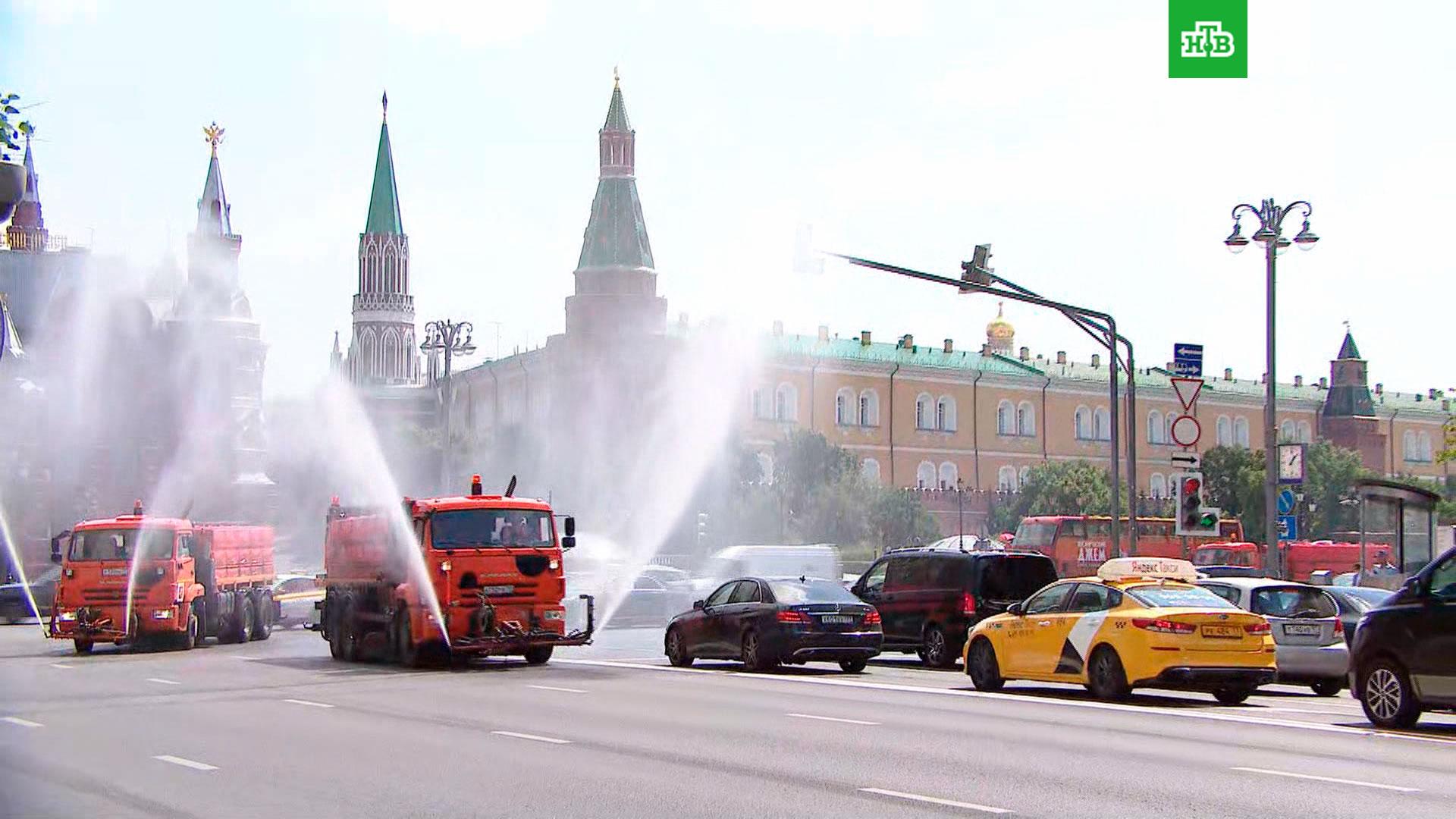 Городская техника регулярно поливает проезжую часть и прилегающие территории. Это делается для того, чтобы охладить асфальт и защитить его от разрушения.