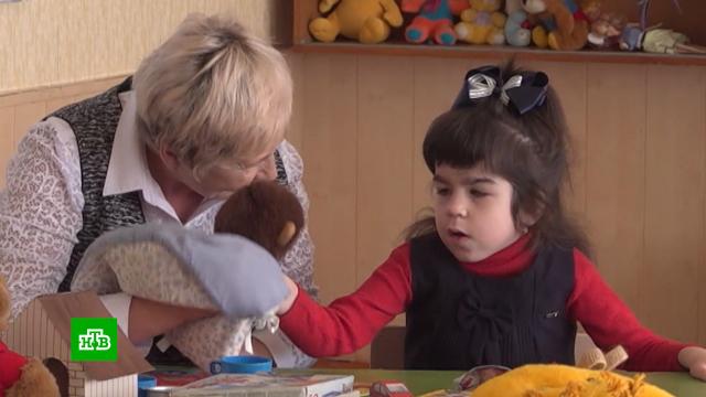 Первоклассница Полина Датченко почти не говорит. На одном из первых уроков она ппытается отвечать преподавателю жестами. Главная задача педагога — установить контакт с ребенком. С теми игрушками, которые заинтересуют девочку, будет дальше и выстраиваться образовательный процесс.