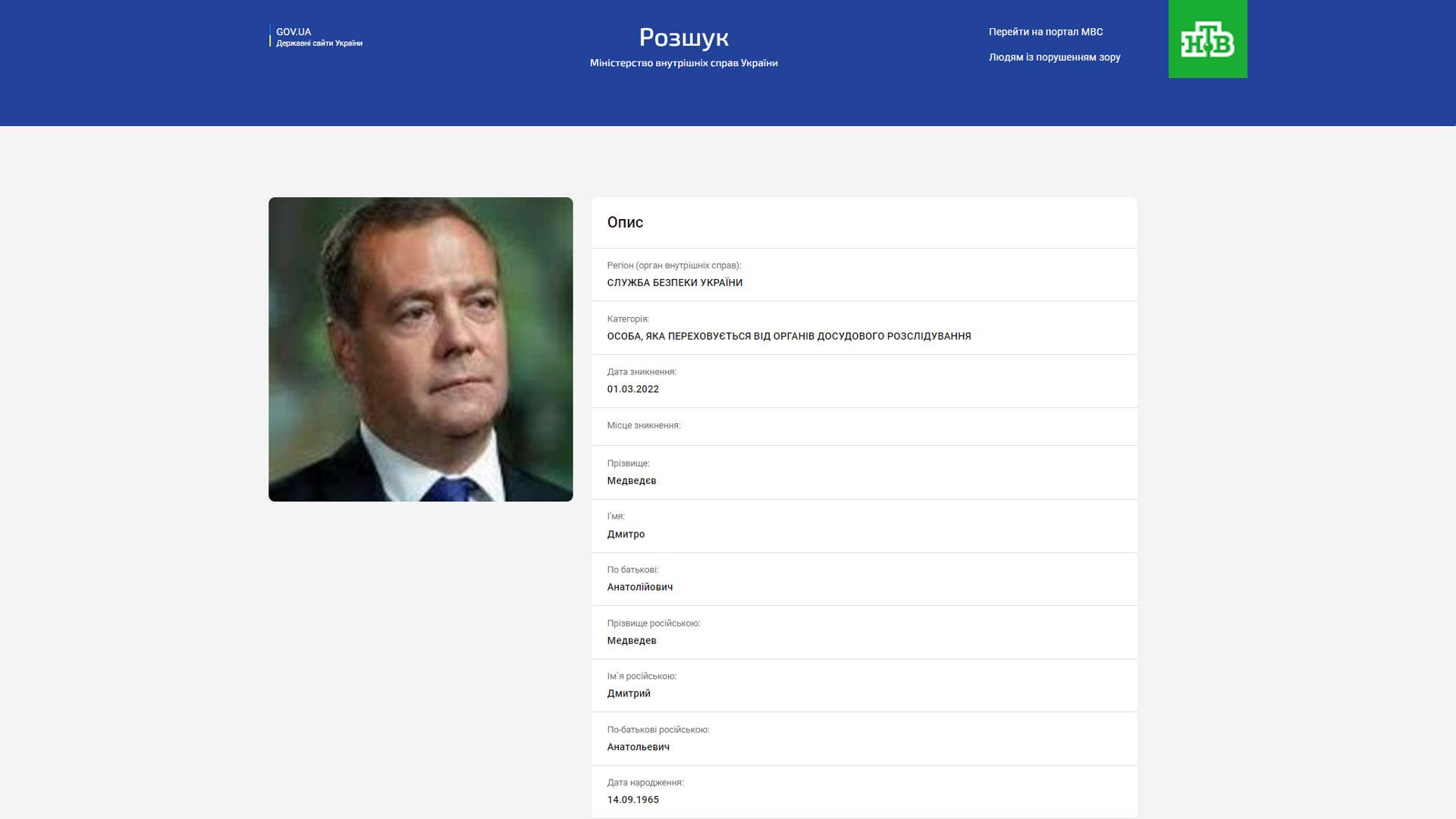 СБУ объявила в розыск заместителя председателя Совбеза РФ Дмитрия Медведева, следует из базы данных МВД Украины.