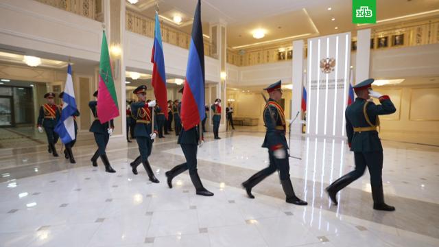 В Совете Федерации прошла торжественная церемония установки флагов новых регионов России.