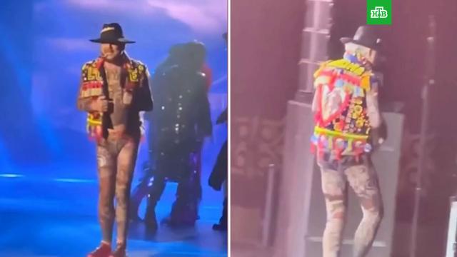 Накануне в соцсетях появились кадры с концерта артиста в Алматы, где он появился на сцене в капроновом лонгсливе и лосинах поверх черных трусов.