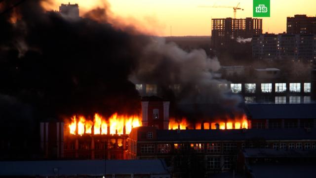 На территории бывшего завода «Зингер» загорелось нежилое здание. По последним данным, площадь пожара уже достигла 2,8 тыс. кв. м. В горящем здании обрушилось перекрытия.