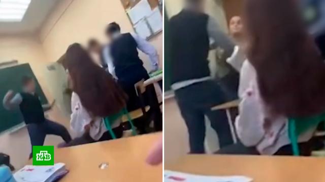В соцсетях разошелся ролик, на котором высокорослый юноша в рубашке и жилетке под испуганные крики школьников бьет классную руководительницу. Одноклассники пытались оттащить подростка от преподавателя.