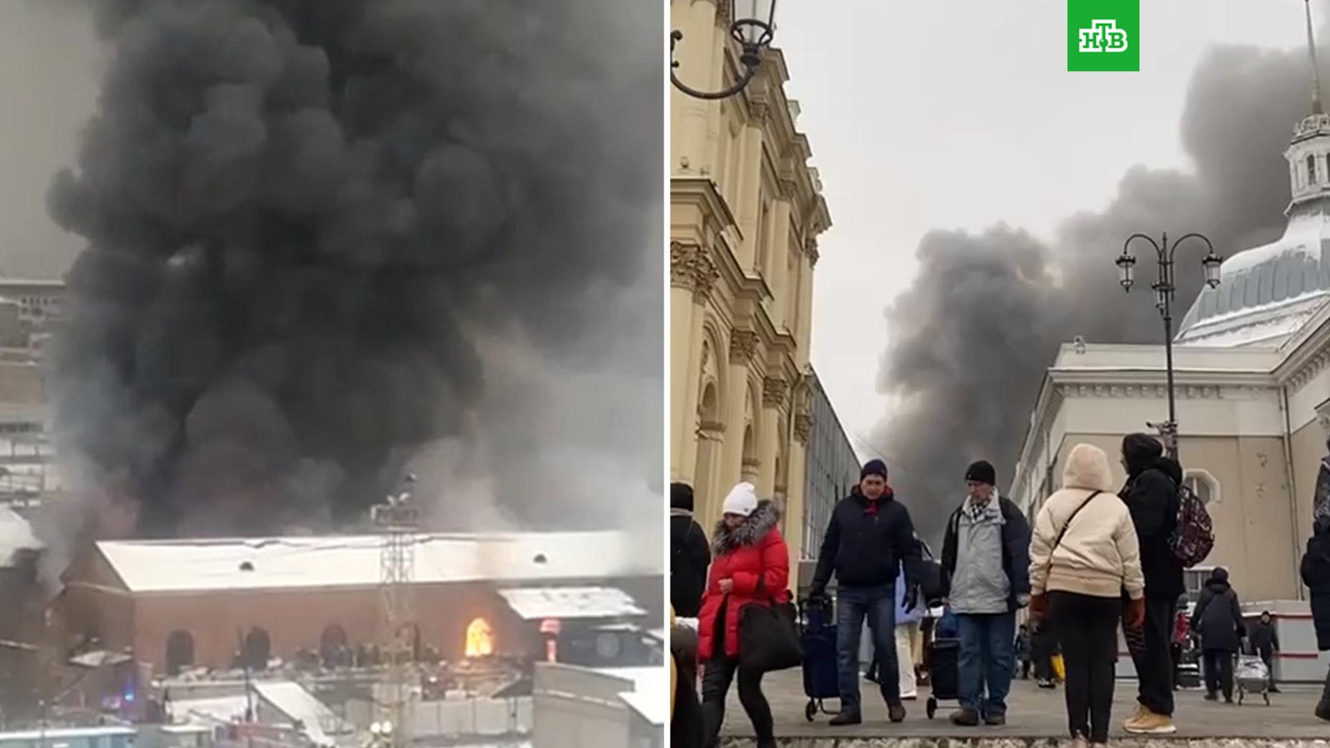 Пожарные спасают людей, которые оказались заблокированными из-за пожара на складе в районе трех вокзалов в центре Москвы.