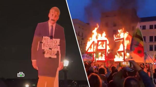 В Париже жгут картонного Эммануэля Макрона и цифры 493 — это статья конституции, позволившая правительству в обход парламента утвердить скандальную пенсионную реформу.