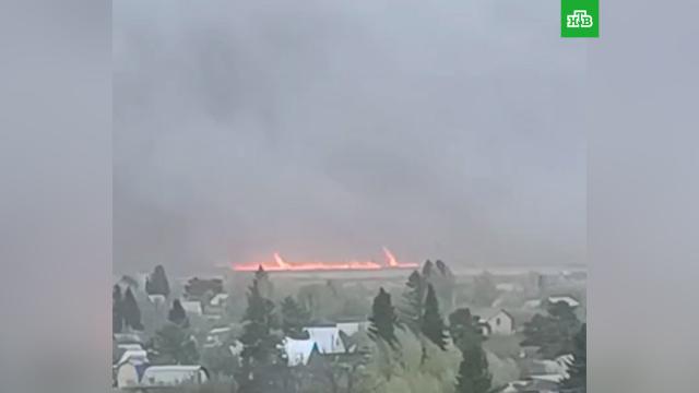 На кадрах видно, что недалеко от населенного пункта бушует пожар, языки пламени ползут по полю и поднимаются вверх.