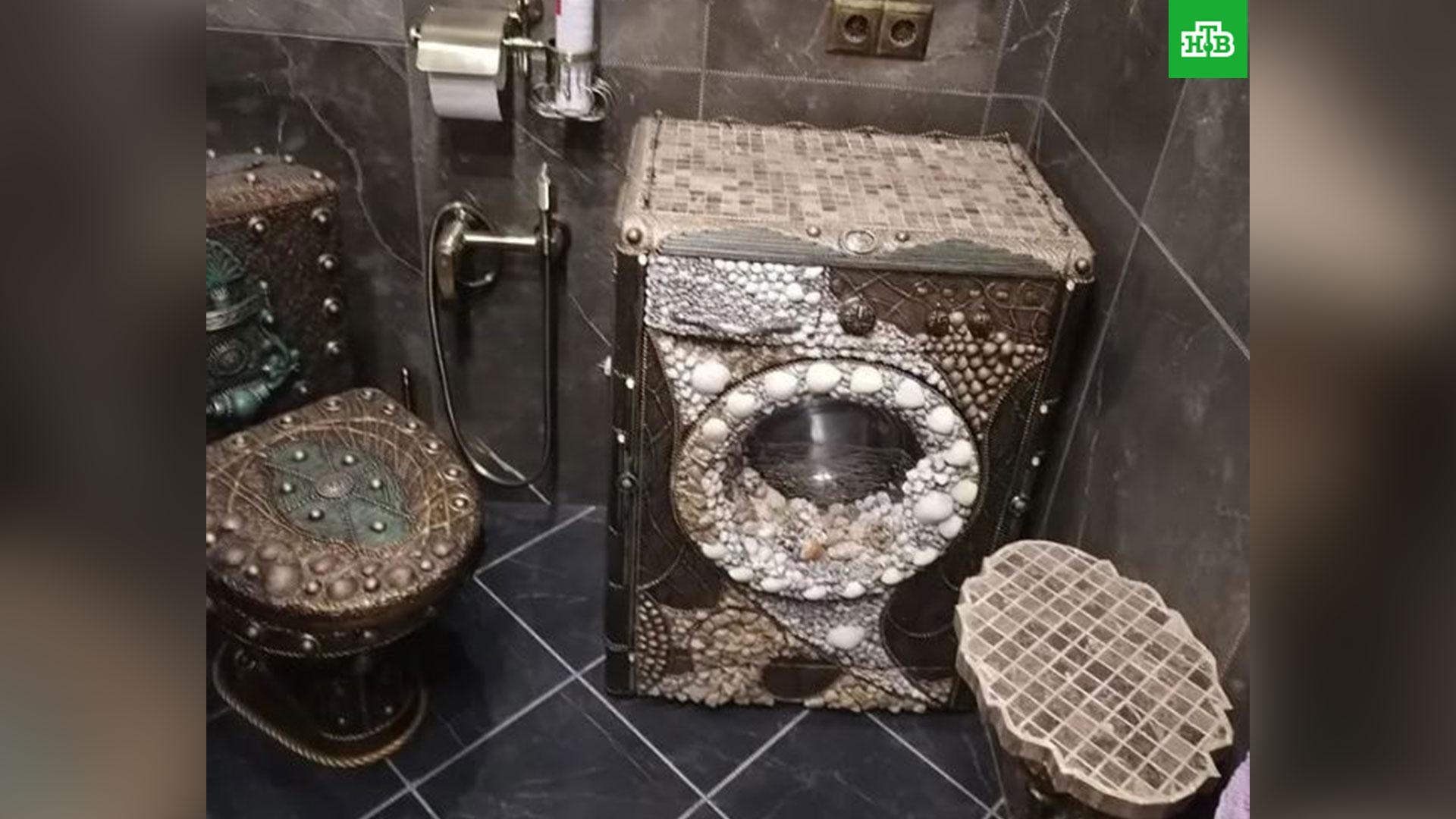 Стиральная машина инкрустирована камнями, раковинами и блестящими золотыми элементами. При взгляде на нее кажется, что это сундук, наполненный сокровищами. На машине цена не указана, но рядом написано, что устройство новое и имеет «индивидуальный дизайн».