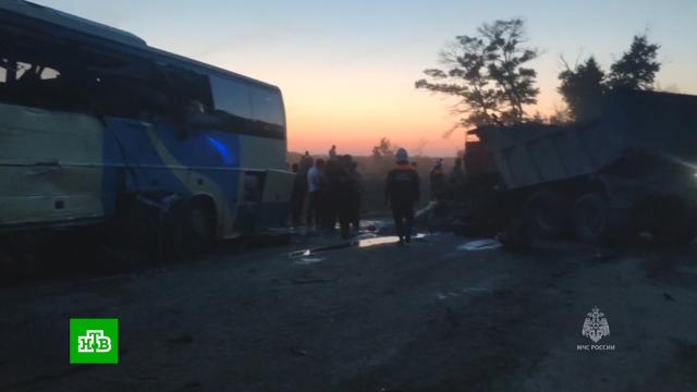 По предварительным данным, Toyota Camry вылетела на встречку, врезалась в грузовик, который после удара протаранил автобус. Возник пожар.