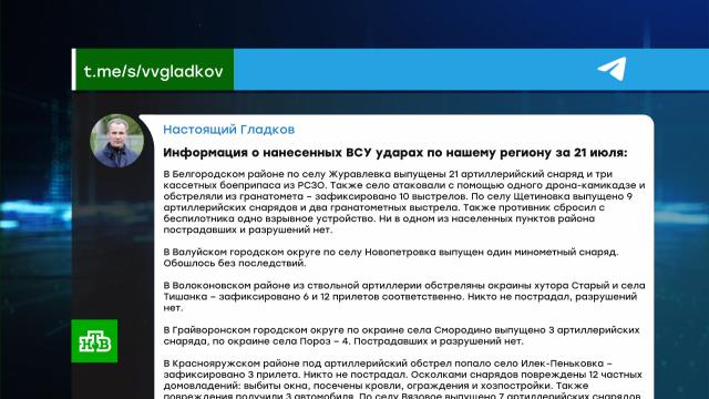 Как сообщил Гладков, за сутки территорию Белгородской области обстреляли более сотни раз. Пострадавших и разрушений, по словам главы региона, нет.