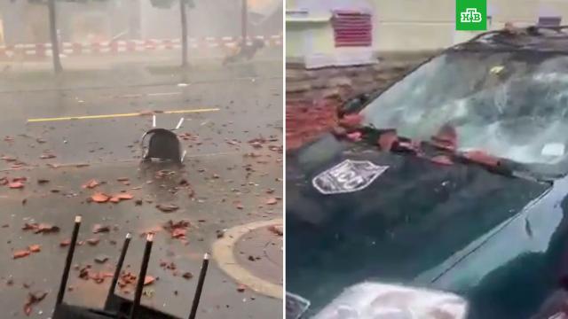 Тем временем очевидцы выкладывают в соцсетях ролики, на которых видно, как очень сильный ветер уносит стулья и столы с террасы. Также можно видеть, что в воздухе летает множество различных предметов.
