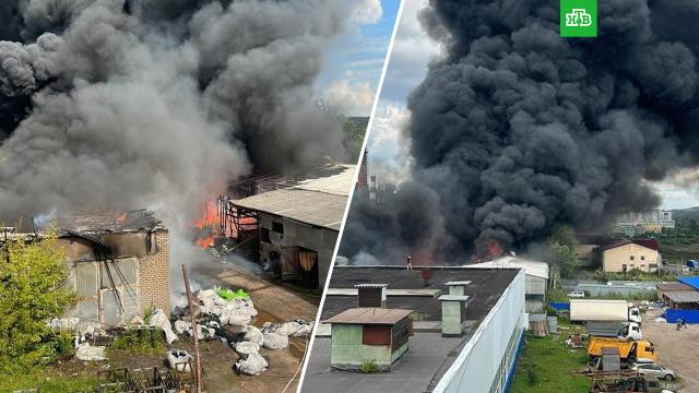 Сильный пожар охватил склад с резиной и пластиком в подмосковной Яхроме. Рядом расположен автоцентр «Лада».