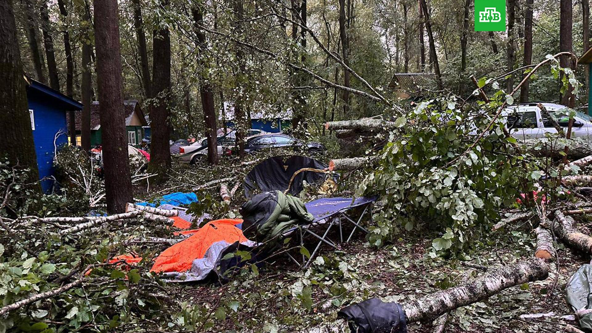 В выходные на турбазе проходил байкерский фестиваль, в лесу был разбит палаточный лагерь. Ураганом повалило множество деревьев, которые упали на палатки. Погибли