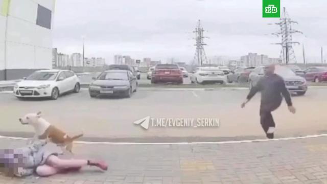 В Калуге бойцовская собака без намордника напала на троих детей на улице и едва не загрызла их. Момент нападения на одного ребенка попал на видео.