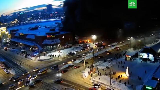 В центре Челябинска загорелись торговые павильоны, столбы черного дыма поднимаются вверх.
