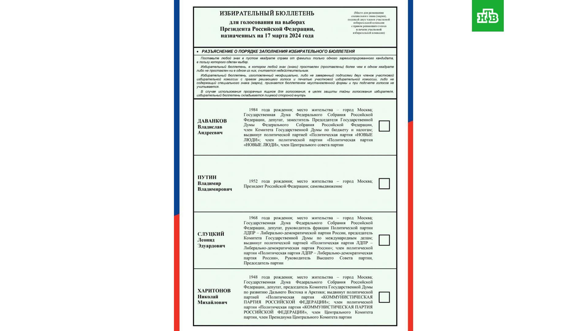 Как решил ЦИК, имена и фамилии кандидатов в президенты РФ будут размещены в бюллетене в алфавитном порядке. Таким образом, первым в списке будет представитель партии «Новые люди» Владислав Даванков, вторым — Владимир Путин, который выступает в качестве самовыдвиженца, третьим — лидер ЛДПР Леонид Слуцкий от ЛДПР, а четвертым — Николай Харитонов из КПРФ.