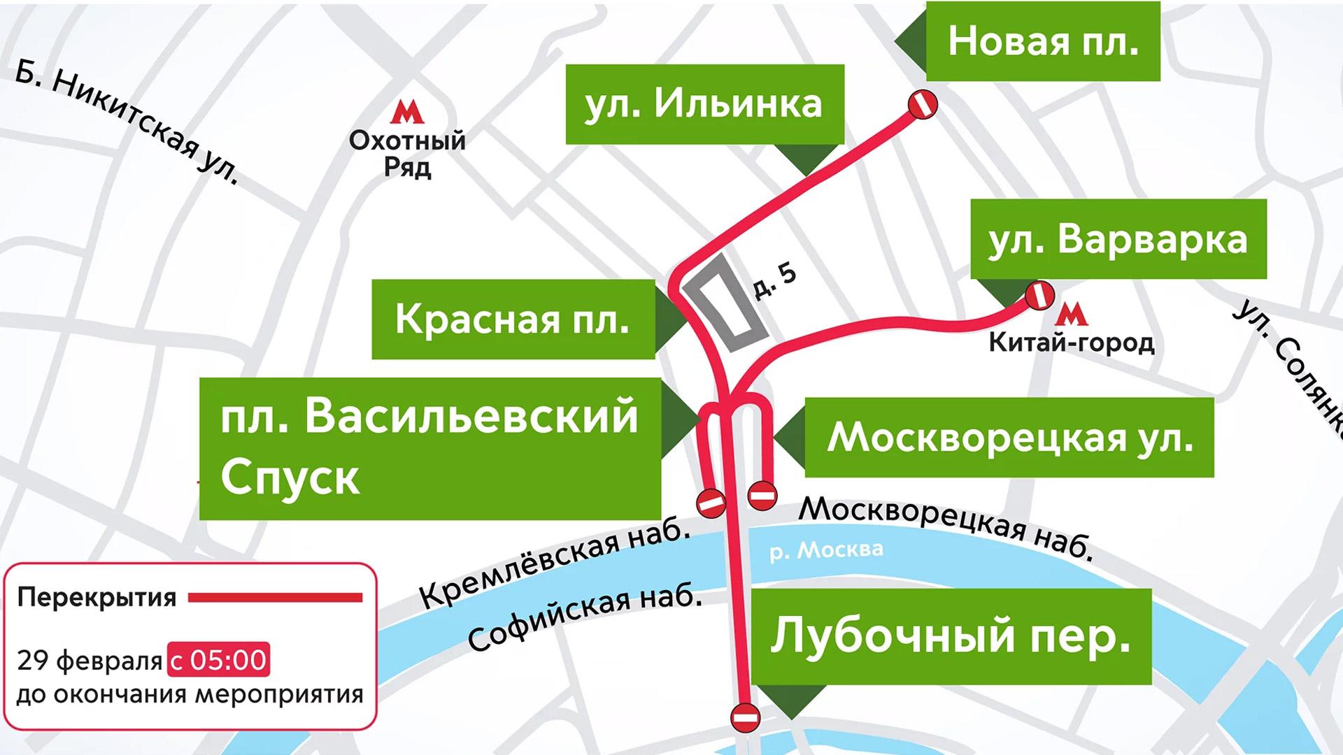 С пяти утра до окончания мероприятия движение будет ограничено на улицах Варварке, Ильинки, Москворецкой, площади Васильевский Спуск, Большом Москворецком мосту и в проезде от Ильинки до Варварки. С 00:01 до окончания мероприятия на Москворецкой улице, Варварке и Ильинке будет запрещена парковка. В департаменте транспорта призвали водителей заранее продумывать маршрут с учетом ограничений.