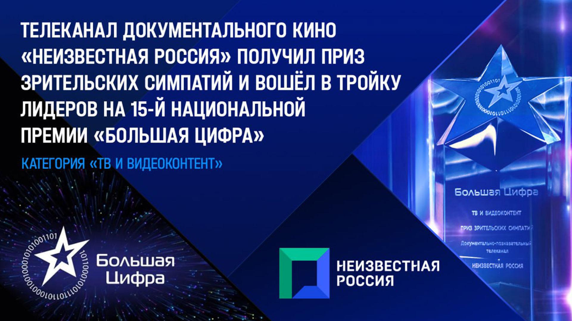 Телеканал документального кино «Неизвестная Россия» получил приз зрительских симпатий и вошел в тройку лидеров на 15-й Национальной премии «Большая Цифра».